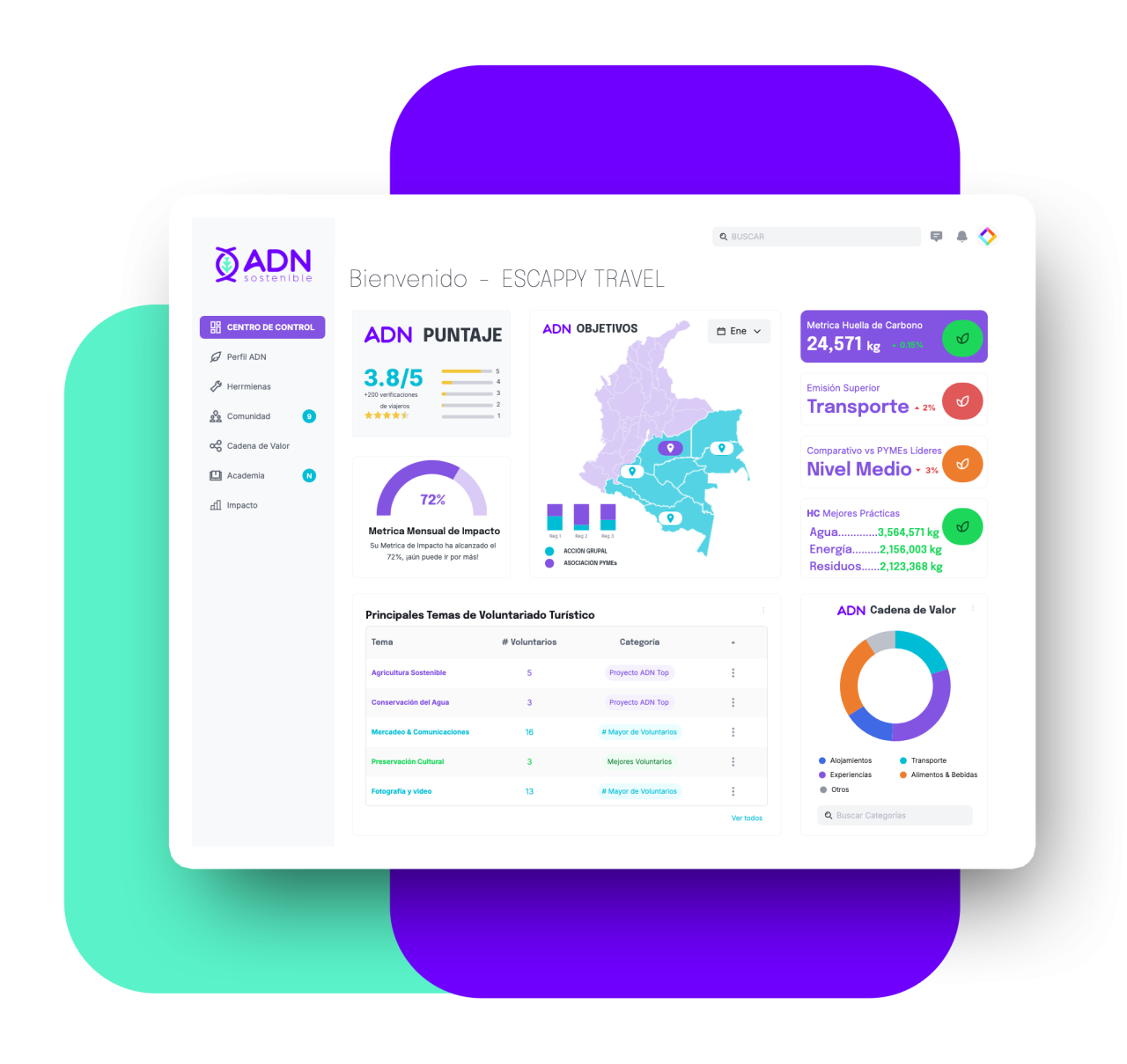 Sustainable DNA is an initiative created to help small and medium-sized tourism companies take care of the environment (territory and community) and demonstrate it reliably. We use advanced technologies, such as blockchain, to ensure that these companies' environmental impact data is transparent and easy to verify.